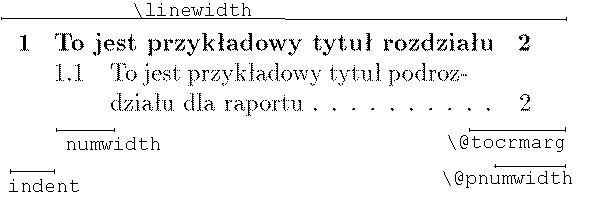 Dodatkowo została zdefiniowana makroinstrukcja \numberline służąca do przekazania numeru (identyfikatora) obiektu; np. numer rozdziału.